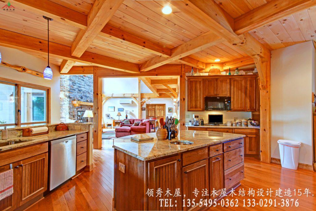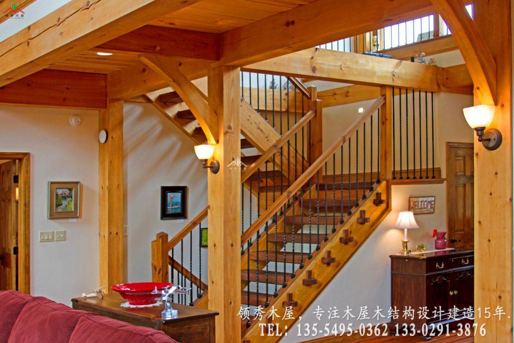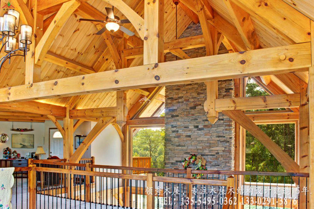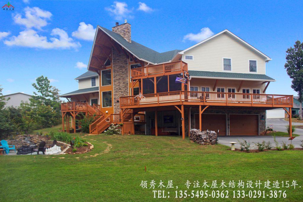 这是领秀木屋为您精选的一套高端私人度假木屋设计方案。项目采用经典的重型梁柱结构,完美融合了天然石材与原木温润的质感。最大的亮点在于其超大挑空的客厅设计:我们特意保留了大量的白色墙面留白,搭配粗犷的木质横梁,既保留了木屋的温馨,又避免了传统全木内饰的昏暗感,营造出一种通透、高级的现代居住体验。这种风格属于现代美式乡村木屋别墅风格。采用三层的设计,一层主要为混凝土结构外包木材,二三层为主体木结构。这样既保证了外观上一体协调是木结构的效果,也能为木屋的防腐防潮耐用性提供更多的保障。