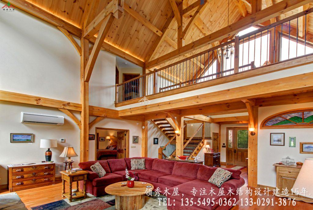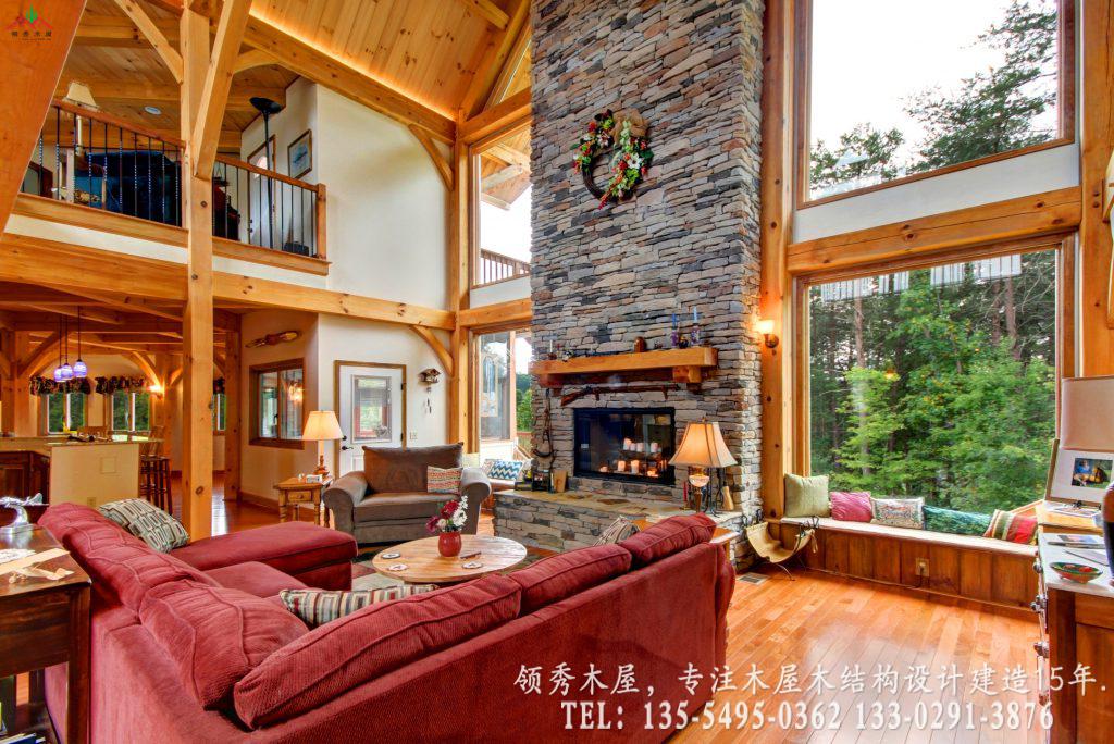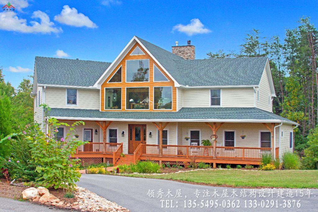 这是领秀木屋为您精选的一套高端私人度假木屋设计方案。项目采用经典的重型梁柱结构,完美融合了天然石材与原木温润的质感。最大的亮点在于其超大挑空的客厅设计:我们特意保留了大量的白色墙面留白,搭配粗犷的木质横梁,既保留了木屋的温馨,又避免了传统全木内饰的昏暗感,营造出一种通透、高级的现代居住体验。这种风格属于现代美式乡村木屋别墅风格。采用三层的设计,一层主要为混凝土结构外包木材,二三层为主体木结构。这样既保证了外观上一体协调是木结构的效果,也能为木屋的防腐防潮耐用性提供更多的保障。