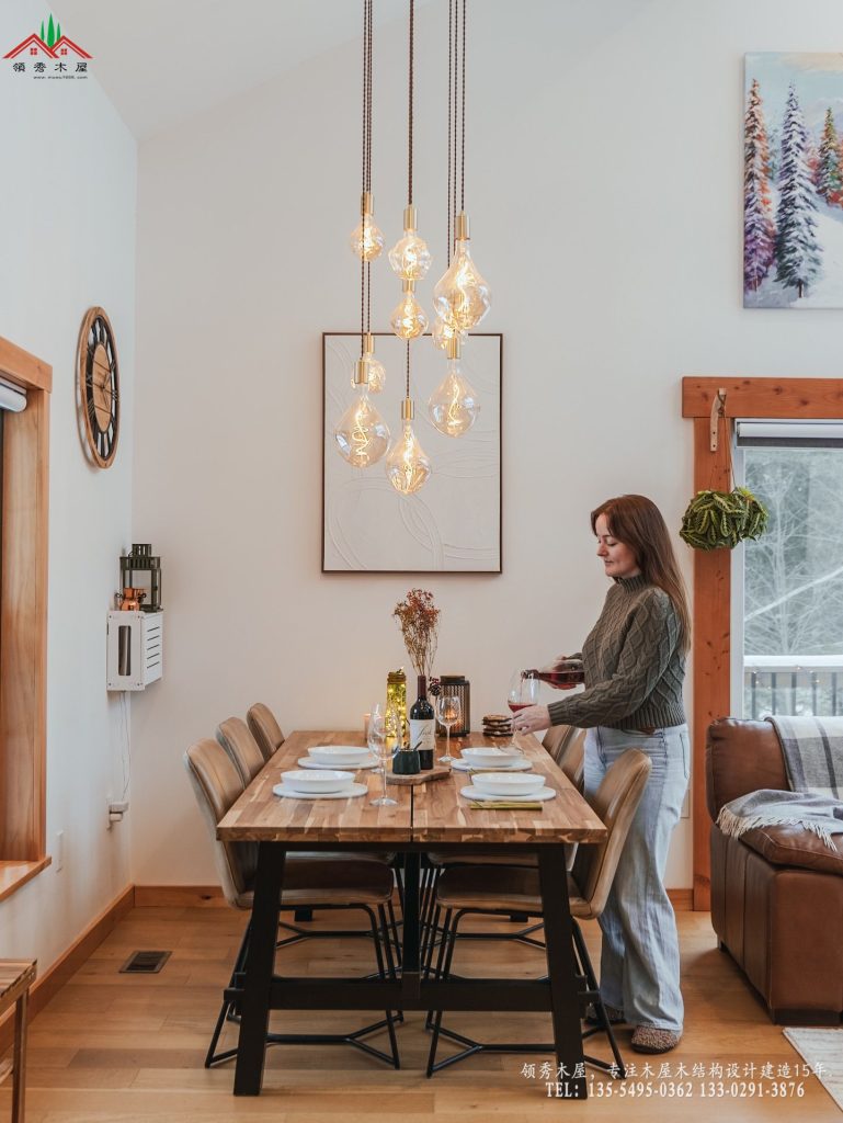 室内采用了挑空客厅设计,空间开阔通透,配合温暖的木质内饰与真火壁炉,让住客在冰天雪地中也能享受到极致的温馨与奢华。采用单坡屋顶施工更方便维护也很好维护,如果您正在寻找高性价比的住宿解决方案,这款单坡顶雪景木屋绝对是您景区的首选。